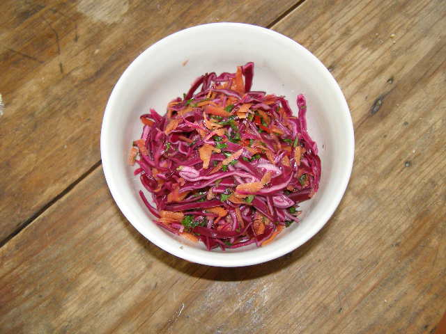 This slaw's delicious if eaten immediately but I find that the flavour develops over a few hours and so usually try to make it in advance and remove it from the 'fridge a little before use so that it can warm a little. If the slaw seems a little watery drain any excess liquid prior to serving.
